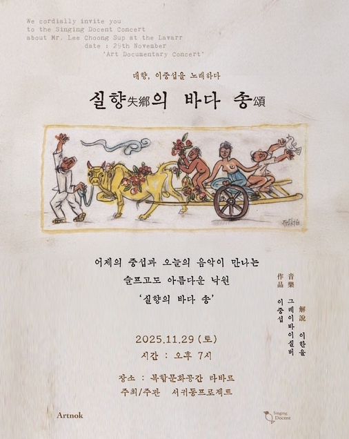 (포탈뉴스통신) 서귀포시 정방동은 11월 29일, 서귀포시 중앙로 13 복합문화공간 워크라운지에서 '대향, 이중섭을 노래하다 ‘실향의 바다 송’' 문화·예술 공연을 개최한다고 밝혔다.