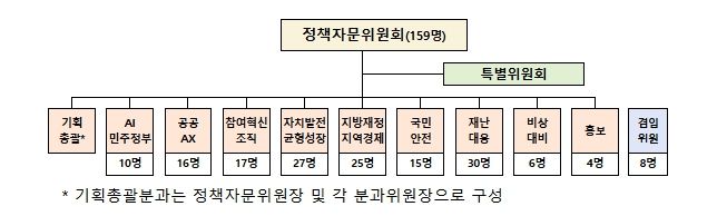 향후 1년(’25.11.24.~’26.11.23.)간 활동하게 되는 제8기 정책자문위원회는 학계·연구원·기업·시민사회 등 다양한 분야의 전문가 159명이 위촉됐으며, 행정안전부 조직개편(’25.11.25. 시행 예정) 내용과 연계해 10개 분과로 구성됐다.