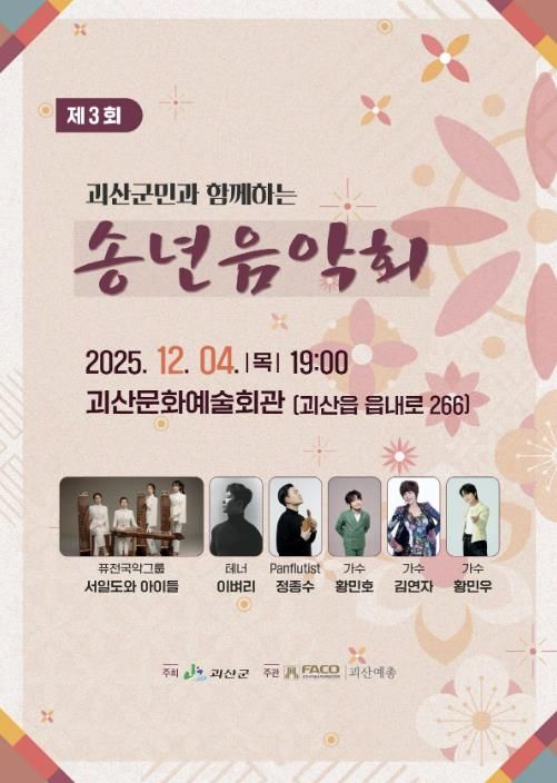 (포탈뉴스통신) 충북 괴산군은 오는 12월 4일 오후 7시, 괴산문화예술회관 공연장에서 2025 괴산군민과 함께하는 송년음악회를 개최한다고 밝혔다.