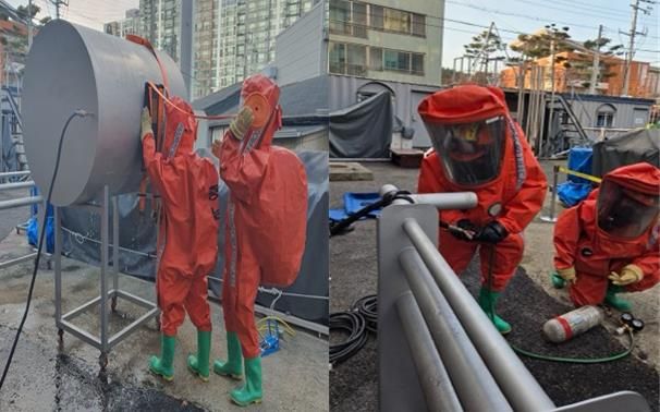 주요 훈련 내용은 ▲화학사고 대응 이론 및 안전관리 교육 ▲화학사고 대응키트를 활용한 누출 차단 실습 ▲유해화학물질 성상 파악 및 초기 제독 조치 ▲A·C급 화학보호복 착·탈의 숙달 ▲누출 현장 위험 요소 분석 및 주변 확산 통제 등이다.