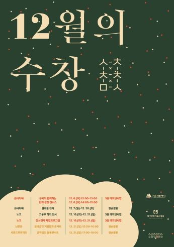 시민창작아트워크 3부 <12월의 수창>의 프로그램 참여와 관람은 무료로 진행되며, 매주 월요일은 휴관이다.