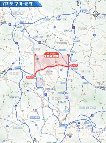 구미와 군위를 연결하는 구미-군위 고속도로는 대구 북부 중앙고속도로와 경북 서부 경부고속도로를 동서로 연결하는 국가간선도로망이며, 왕복 4차선 연장 21.2km 규모로 총사업비 1조 5,627억 원을 투입해 2029년 착공을 목표로 국가 재정 사업으로 본격 추진 된다.