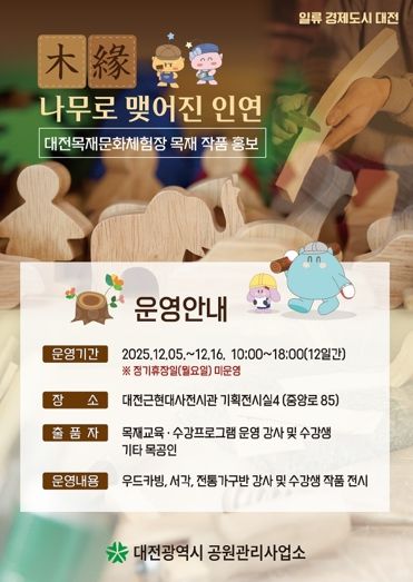 (포탈뉴스통신) 대전시는 공원관리사업소(목재문화체험장) 주관으로 12월 5일부터 16일까지 대전근현대전시관 기획전시실에서 목재교육·수강 프로그램에 참여한 강사와 수강생들의 작품 80여 점을 특별전시한다.