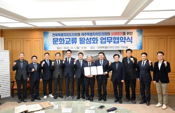 (포탈뉴스통신) 제주특별자치도의회는 12월 1일 오후 14시 전북특별자치도의회 의장실(의장 문승우)에서 전북특별자치도의회와 문화교류 활성화 및 지역 상생발전을 위한 업무협약(MOU)을 체결했다고 밝혔다.