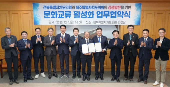 (포탈뉴스통신) 전북특별자치도의회와 제주특별자치도의회는 문화·관광·세계유산 분야 협력을 강화하기 위해 1일 전북도의회 의장실에서 문화교류 활성화 업무협약(MOU)을 체결했다.