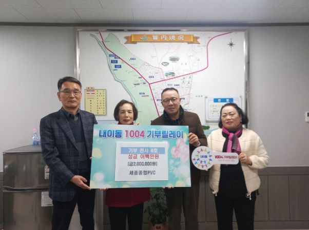 (포탈뉴스통신) 밀양시 내이동 세종종합PVC(대표 정병욱)은 지난 7월 ‘100+4 기부릴레이 시즌2’의 첫 주자로 참여한 데 이어 2일 내이동 자원봉사회(회장 서정구)에 200만 원을 추가로 기탁했다.