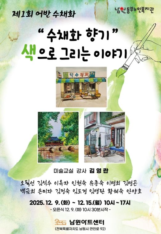 (포탈뉴스통신) 남원시가 직영으로 운영하는 남원동부노인복지관 미술교실에서 꾸준히 활동해 온 어르신들은 김영란 강사와 함께 한 해 동안 완성한 작품들을 모아 첫 번째 작품 전시회인 '제1회 어반 수채화 전시회: 수채화 향기'를 마련해 2025년 12월 9일부터 15일까지 남원아트센터에서 선보이고 있다.