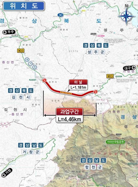 본 구간은 지방도 903호선의 마지막 미개설 구간으로 북측 성주군 금수강산면으로 약35㎞, 40분 거리를 우회했으나, 1.1㎞ 증산가천터널 관통 등 본 도로의 개통으로 이동시간이 6분으로 단축된다.