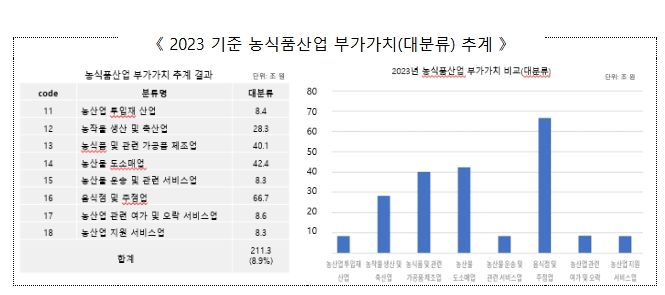 그간 농업 부가가치는 주로 쌀·채소·과일·축산업 등 1차 생산물 중심으로 집계되어 전 산업의 1% 수준에 불과한 것으로 알려져 왔으나, 연구 결과에 따르면 투입재를 비롯한 농산물의 가공·포장·유통 등 연관 산업과 스마트농업, 반려동물산업 등 신산업을 포함하면 그 비중이 ’23년 기준으로 전체 산업의 8.9% 수준, 부가가치 규모도 211조 원에 달하는 것으로 나타났다.