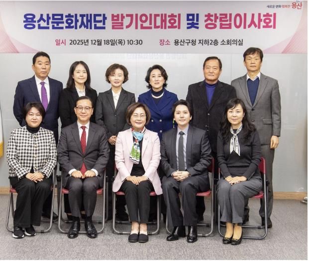 용산문화재단은 초대 이사장을 비롯해 대표이사, 이사, 감사 등 임원진을 공개모집으로 구성했으며, 이날 발기인대회와 창립이사회를 거치며 설립 막바지 단계에 접어들었다. 재단 설립은 2022년 기본계획 수립 이후 전문기관 타당성 검토와 서울시 출연기관운영심의위원회 심의를 통해 공공성과 필요성을 인정받았으며, 2025년 9월 ‘서울특별시 용산구 문화재단 설립 및 운영에 관한 조례’ 공포로 제도적 기반을 마련했다.