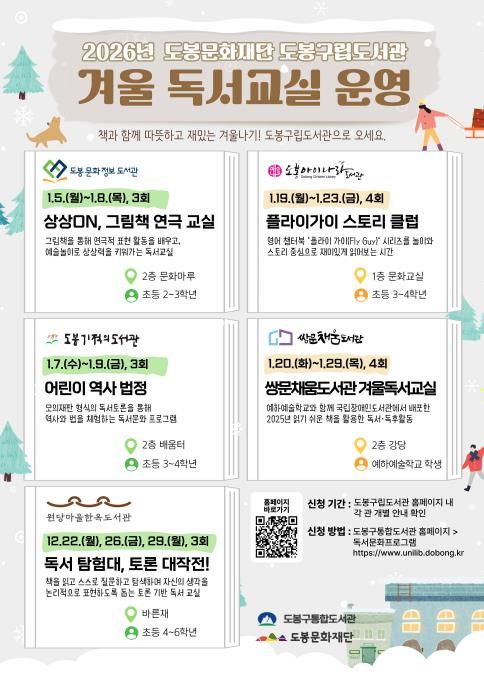 (포탈뉴스통신) 서울 도봉구 도봉문화재단 소속 구립도서관 5개관이 ‘2026년 겨울 독서교실’을 운영한다.