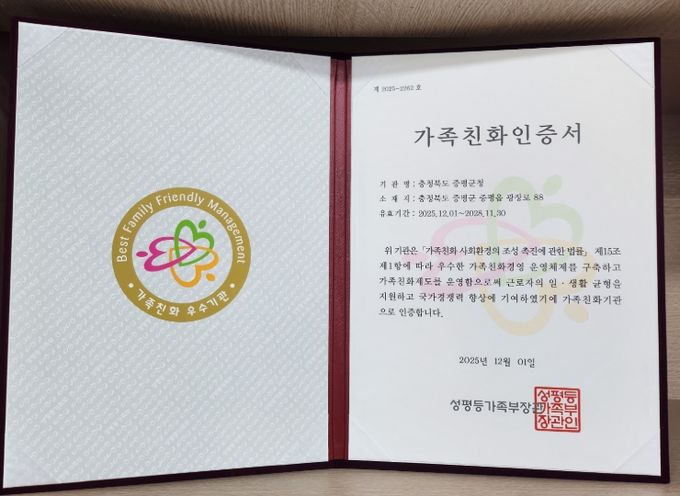 증평군은 2014년 첫 가족친화인증을 획득한 이후 2017년, 2019년, 2022년 재인증을 거쳐 올해 또다시 재인증을 받아 2028년 11월까지 3년간 자격을 유지하게 됐다.
