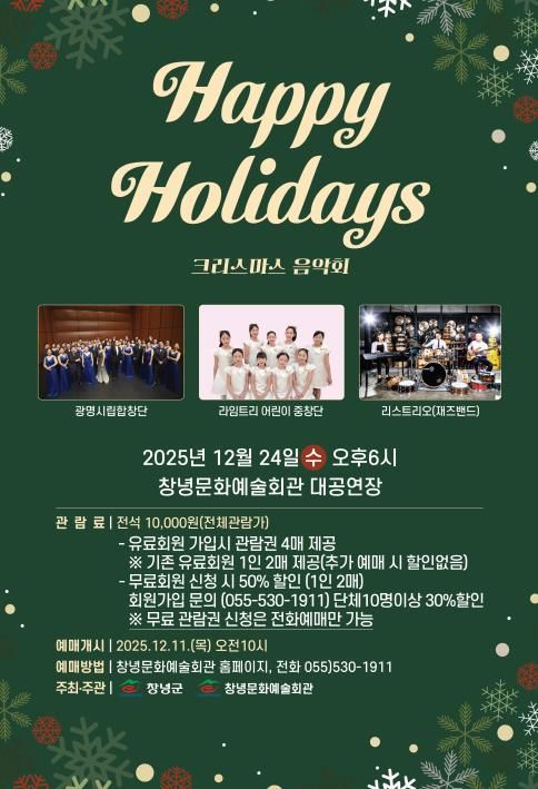 (포탈뉴스통신) 창녕군은 오는 24일 오후 6시 창녕문화예술회관 대공연장에서 온 가족이 함께 즐길 수 있는 기획공연 ‘크리스마스 음악회’를 개최한다고 밝혔다.