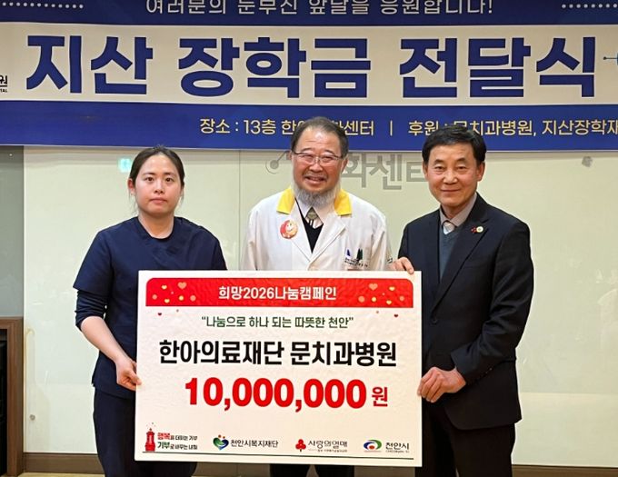 (포탈뉴스통신) (재)천안시복지재단은 지난 22일 한아의료재단 문치과병원이 학업장려금 3,000만 원을 기탁했다고 밝혔다.