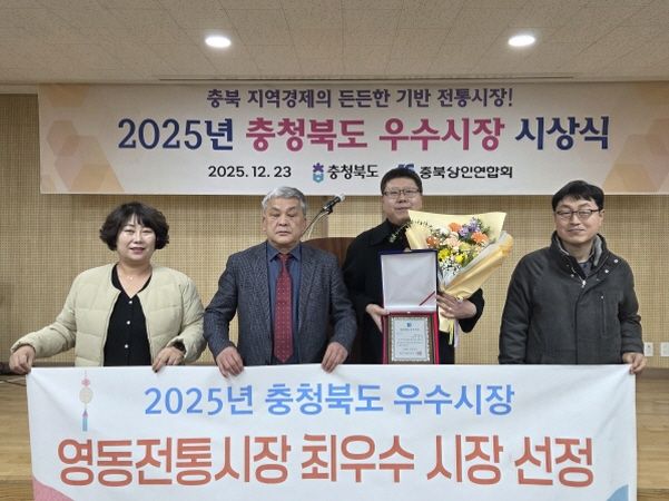 영동전통시장상인회는 23일 충북상인연합회 주관으로 충북상인연합회 회의실에서 열린 2025년 충청북도 우수 전통시장 시상식에서 최우수시장 인증패와 시상금 720만 원을 받았다.