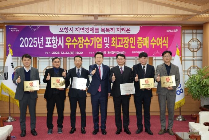 (포탈뉴스통신) 포항시는 23일 시청 대외협력실에서 ‘2025년 포항시 우수장수기업 및 최고장인 증패수여식’을 개최했다.