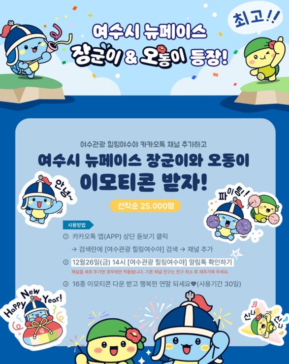 (포탈뉴스통신) 여수시가 새롭게 리뉴얼된 마스코트 ‘장군이·오동이’ 카카오톡 이모티콘을 오는 26일 오후 2시부터 선착순 2만 5천 명에게 무료로 배포한다고 밝혔다.