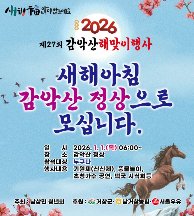 이재윤 남상면청년회장은 “감악산 해맞이 행사는 지역 주민들이 함께 새해를 맞이하며 화합을 다지는 전통 있는 행사”라며, “2026 거창방문의 해를 앞두고 감악산을 찾는 모든 분께 따뜻한 새해의 시작을 선물할 수 있도록 정성을 다해 준비하겠다”고 말했다.