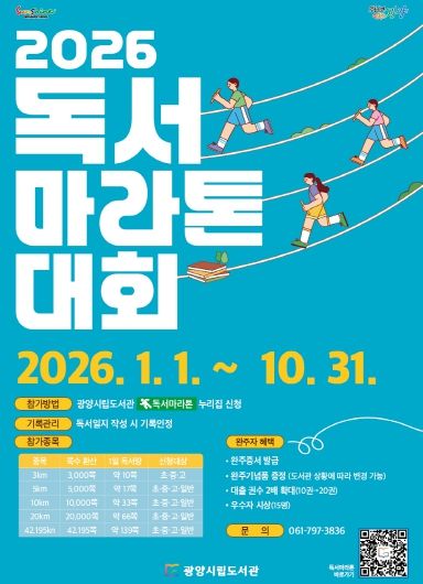 (포탈뉴스통신) 광양시립도서관이 지역사회에 독서문화 확산을 위해 2026년 1월 1일부터 10월 31일까지 ‘2026 광양시 독서마라톤 대회’를 운영한다.