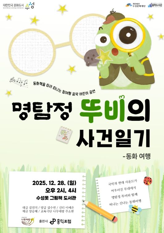한편, 이번 공연의 원작인 ‘명탐정 뚜비의 사건일기’는 수성구립도서관을 통해 열람 및 대출이 가능하며, 본 공연은 대한민국 문화도시 수성 사업의 일환으로 추진된다.