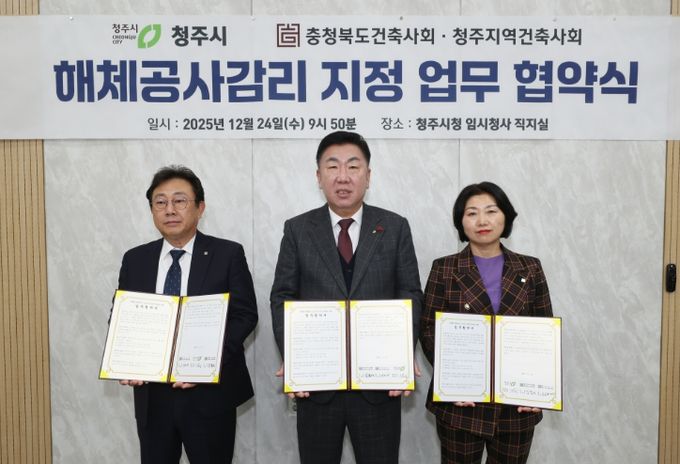 (포탈뉴스통신) 청주시는 24일 대한건축사협회 충청북도건축사회, 청주지역건축사회와 ‘건축물 해체공사 감리자 지정 업무대행에 관한 업무협약(MOU)’을 체결한다.