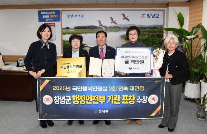 국민행복민원실은 행정안전부가 전국 공공기관 민원실을 대상으로 민원실 내·외부 환경과 민원 서비스 등 4개 분야 25개 항목을 종합 평가해 우수기관을 선정·인증하는 제도다. 창녕군은 2019년 신규 인증을 시작으로 2022년 재인증, 2025년까지 3회 연속 인증을 받았다.