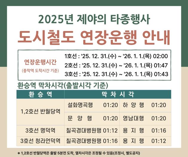한편, 행사 당일 밤 10시 30분부터 다음날 01시 30까지 동인네거리~삼덕네거리, 공평네거리~동신교 서편 구간이 전면 통제된다. 행사장 인근을 통과하는 시내버스 18개 노선*은 밤 10시 30분 이후 행사장을 우회 운행하고, 직행 1개 노선과 급행 4개 노선**은 새벽 1시경 시내를 통과한다. 도시철도는 반월당역과 명덕역을 다음날 01시 10분경 통과하도록 연장 운행해 시민들의 안전한 귀가를 도울 계획이다.