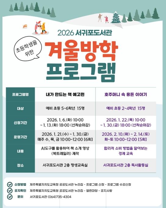 (포탈뉴스통신) 제주도교육청 서귀포도서관은 겨울방학을 맞아 어린이들의 호기심을 자극해 책 읽기의 즐거움과 경제 감각을 키우는 겨울방학 프로그램을 운영하며, 내년 1월 6일부터 참가자를 모집한다.
