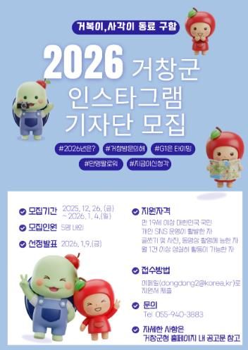 (포탈뉴스통신) 거창군은 지역 관광자원의 매력을 생생하게 전달하고 온라인 홍보를 강화하기 위해 ‘2026년 거창군 인스타그램 기자단’을 모집한다고 26일 밝혔다.
