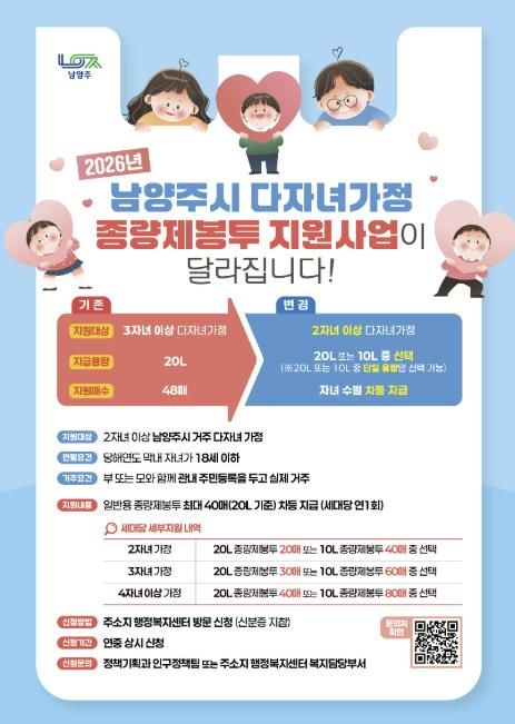 ‘다자녀가정 종량제봉투 지원사업’은 다자녀가정의 경제적 부담을 줄이기 위해 추진 중인 사업으로, 기존에는 3자녀 이상 가정만 지원 대상에 포함돼 있었다. 시는 이번 제도 개선을 통해 정부의 다자녀 기준(2자녀 이상)을 반영해 보다 많은 가정이 혜택을 받을 수 있도록 했다.