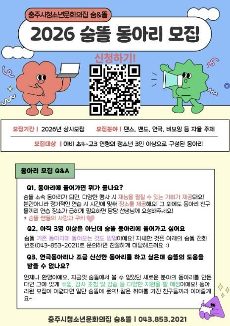 (포탈뉴스통신) 충주시청소년문화의집 숨&뜰은 2026년 한 해 동안 청소년들의 자율적인 문화 활동을 지원하기 위해 청소년 동아리를 상시 모집한다고 밝혔다.