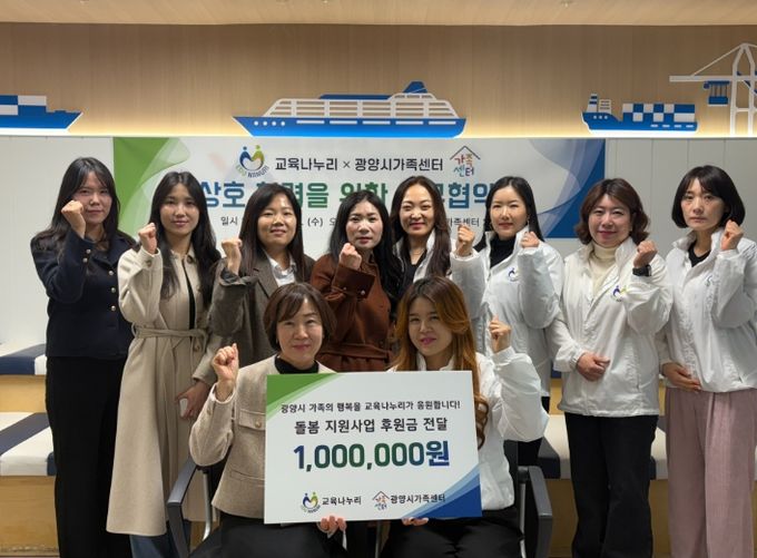협약식과 함께 열린 후원금 전달식에서는 교육나누리가 광양시가족센터 돌봄지원팀에 후원금 100만 원을 기탁했으며, 해당 후원금은 가족 대상 돌봄지원사업인 ‘공동육아나눔터’ 프로그램 운영에 활용될 예정이다.
