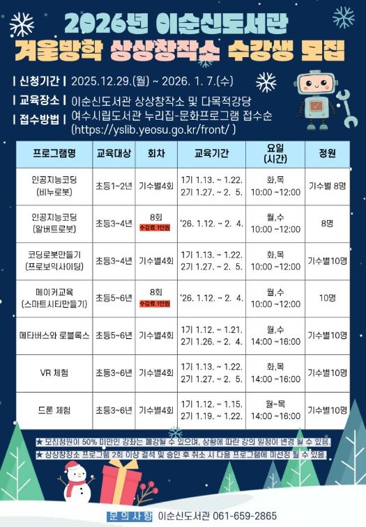 (포탈뉴스통신) 여수시는 12월 29일부터 2026년 1월 7일까지 ‘2026년 이순신도서관 겨울방학 상상창작소’ 수강생을 선착순 모집한다.