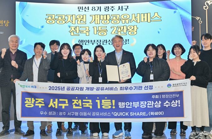 이번 평가는 전국 공공기관의 공공자원 개방 실적과 공유서비스 운영 사례 등을 종합적으로 심사해 우수 기관을 선정한 것으로 서구는 2023년에 이어 두 번째로 전국 1위에 오르며 민선8기 공유정책이 전국 최고 수준임을 다시 한 번 입증했다.