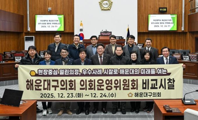 김상수 의회운영위원장은 “이번 시찰을 통해 리모델링으로 쾌적하고 선진화된 경주시의회의 청사 환경과 체계적인 공간 구성을 직접 확인할 수 있었다”며, “오는 2027년 말 입주를 목표로 건립 중인 해운대구의회 신청사에 이번 벤치마킹 결과를 적극 반영하여, 의원들이 의정 활동에 온전히 전념할 수 있는 현대적인 시설 환경과 직원들이 자부심을 갖고 일할 수 있는 쾌적한 근무 여건을 조성하는 데 최선을 다하겠다.”고 밝혔다.