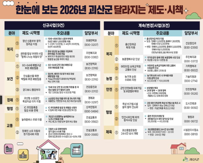 (포탈뉴스통신) 충북 괴산군은 2026년 병오년 새해를 맞아 군민의 일상에서 '바로 체감되는 변화'를 만드는 생활밀착형 정책을 본격 시행한다.