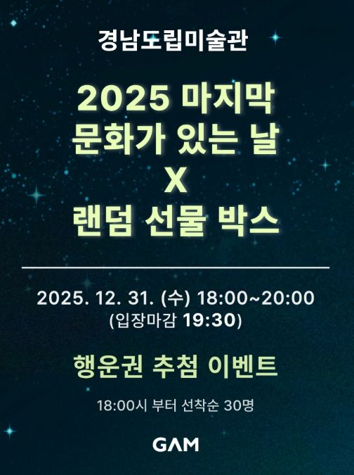 (포탈뉴스통신) 경남도립미술관은 12월 31일 ‘문화가 있는 날’을 맞이해 연말을 함께 즐길 수 있는 특별 이벤트를 마련한다고 밝혔다.