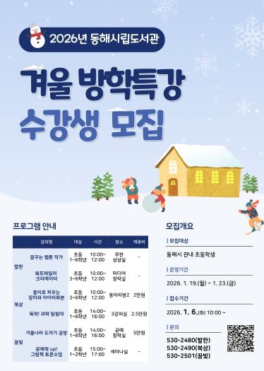 (포탈뉴스통신) 동해시는 2026년 겨울방학을 맞아 관내 초등학생을 대상으로 동해시립도서관에서 겨울방학 특강 프로그램을 운영한다고 밝혔다.