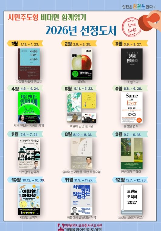 (포탈뉴스통신) 인천광역시교육청서구도서관은 12월 31일 ‘2026년 시민주도형 비대면 함께읽기’ 도서 15권을 선정·발표했다.