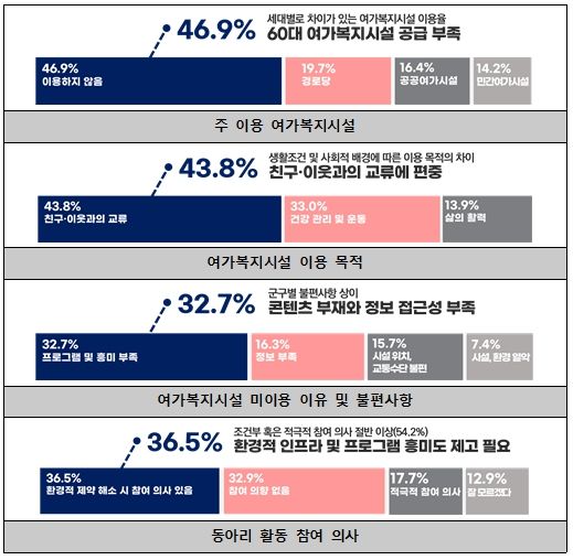 특히 60대 신노년층의 경우 노인여가복지시설 이용률이 상대적으로 낮아, 기존의 정책이 충분히 작동하지 않는 것으로 분석됐다.