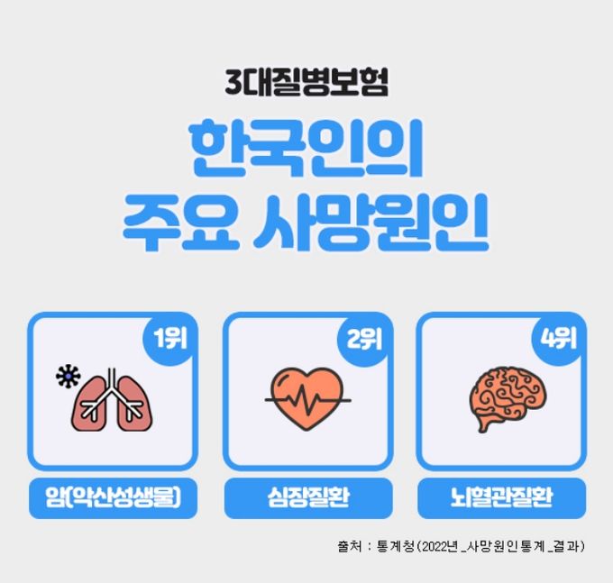 (포탈뉴스통신) 3대질병으로 일컬어지는 암, 뇌혈관질환, 심혈관질환은 한국인의 주요 사망원인에서 상위를 차지하고 있으며, 이에 대한 진단비를 집중적으로 보장해 주는 보험상품을 3대질병진단비 보험이라 할 수 있다.
