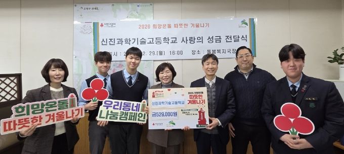 박동수 신진과학기술고등학교 교감은 “학생과 교직원이 함께한 이번 성금 전달이 지역사회에 작은 힘이 되기를 바란다”며 “앞으로도 나눔을 실천하는 교육을 지속해 나가겠다”고 말했다.