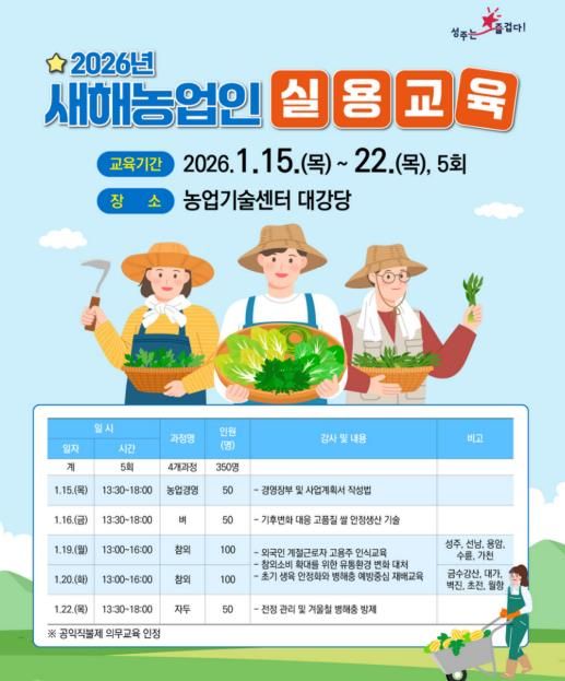 (포탈뉴스통신) 성주군은 오는 1월 15일부터 22일까지 농업기술센터 대강당에서 지역 농업인 350여명을 대상으로 '2026년 새해농업인실용교육'을 실시한다.