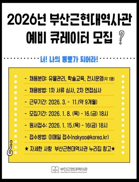 (포탈뉴스통신) 부산근현대역사관은 박물관 학예 분야 전문인력 양성과 청년 일자리 창출을 위해 오늘(8일)부터 1월 16일까지 '2026년 부산근현대역사관 예비 큐레이터(기간제근로자)'를 공개 모집한다고 밝혔다.
