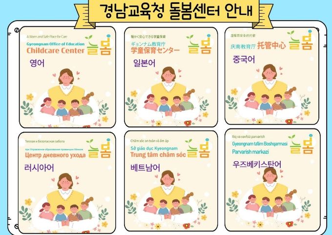 (포탈뉴스통신) 경상남도교육청은 다문화 가정과 외국인 학부모가 돌봄 서비스를 쉽게 이해할 수 있도록 경남교육청 돌봄센터 ‘늘봄’ 안내자료를 6개 국어로 제작해 배포했다. 지원 언어는 영어, 일본어, 중국어, 베트남어, 러시아어, 우즈베키스탄어이다.