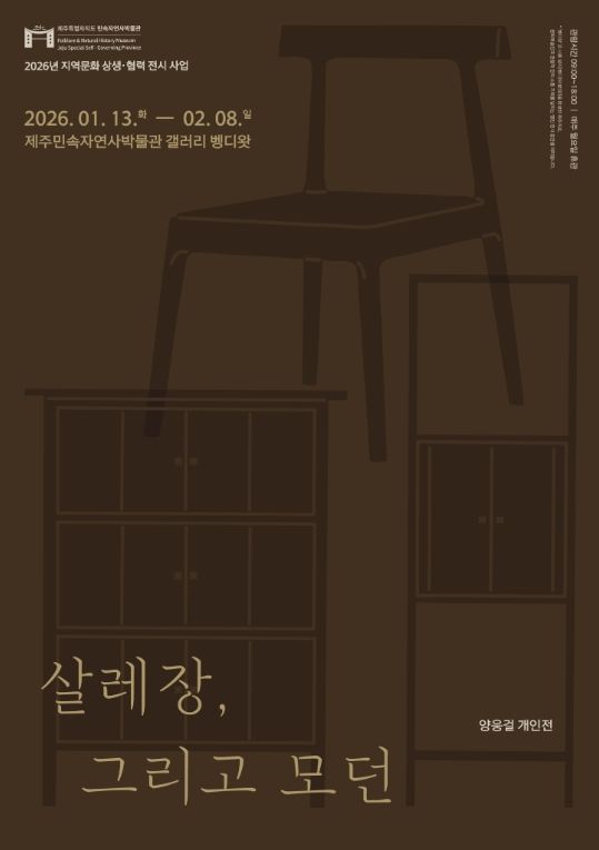 (포탈뉴스통신) 제주민속자연사박물관은 ‘지역문화 상생·협력 전시 사업’의 일환으로 1월 13일부터 2월 8일까지 갤러리 벵디왓에서 양웅걸 개인전 '살레장, 그리고 모던'을 개최한다.