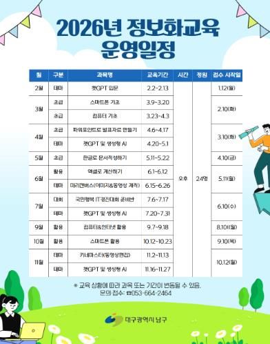(포탈뉴스통신) 대구 남구는 구민을 대상으로 2026년 정보화교육을 실시한다고 밝혔다.