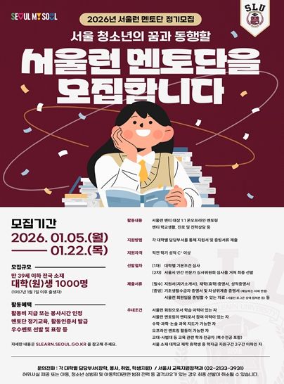(포탈뉴스통신) 서울시는 대학생들이 자신의 지식과 경험을 나누며 장학금 혜택과 취업 역량까지 쌓을 수 있는 ‘서울런 멘토단’ 신규 멘토 1,000명을 22일까지 모집한다.