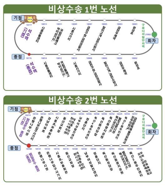 구는 2개 권역에 총 11대의 임시 무료셔틀버스를 투입한다. 오전 5시부터 밤 10시까지 오전과 오후 10~20분 배차간격으로 운행한다.