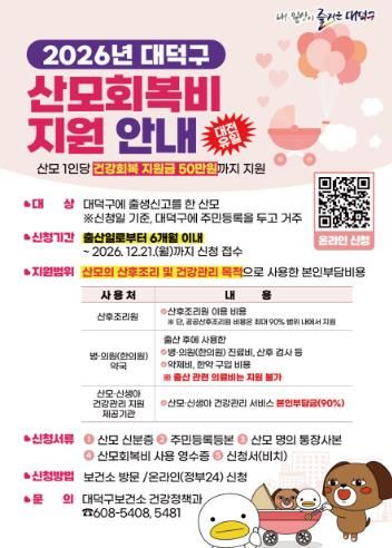 신청은 △신분증 △주민등록등본 △산모 명의 통장 사본 △산모회복비 사용 영수증 등을 지참해 대덕구보건소를 방문하거나 정부24를 통한 온라인 신청이 가능하다.